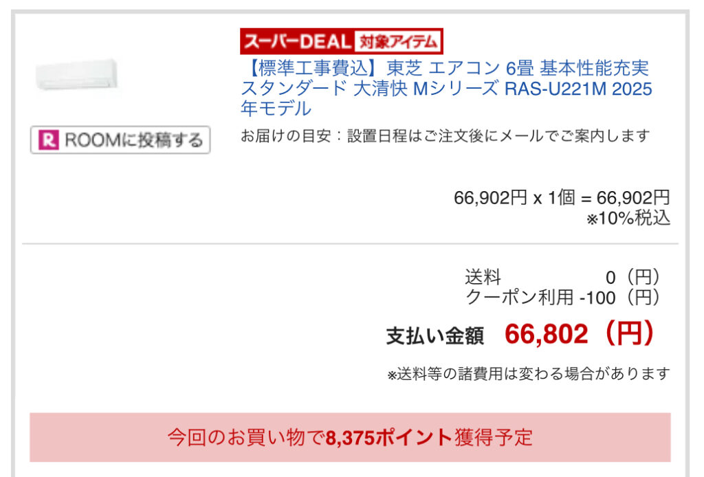 新春セール+スーパーDeal対象で、支払額66,802円、8,375ポイント獲得予定でした✨